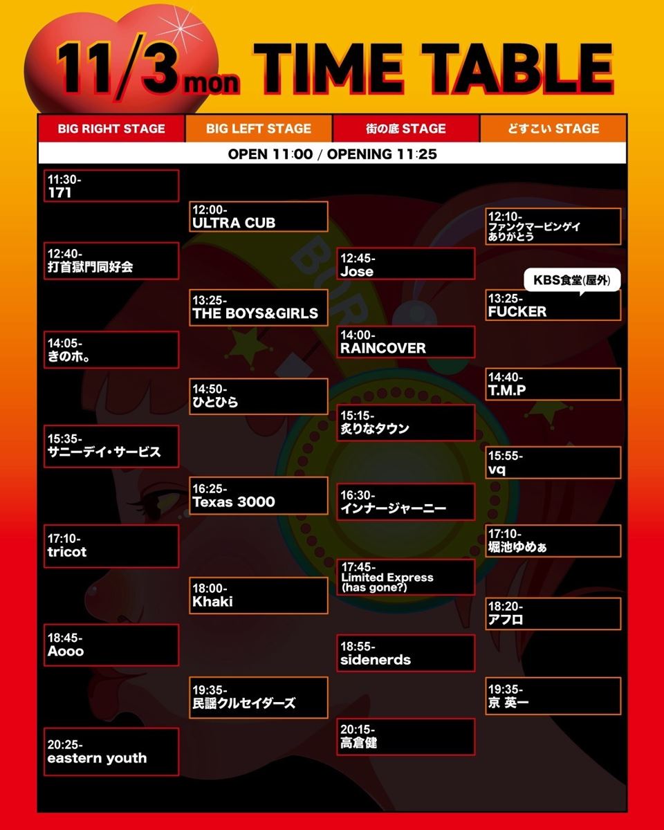 eastern youth/サニーデイ・サービス/民謡クルセイダーズ/打首獄門同好会/tricot/Aooo/Limited Express (has gone?)/ひとひら/アフロ/Khaki/きのホ。/171/THE BOYS&GIRLS/Texas 3000/ULTRA CUB/京英一/sidenerds/高倉健/FUCKER/T.M.P/インナージャーニー/炙りなタウン/RAINCOVER/堀池ゆめぁ/vq/ファンクマービンゲイありがとう/Jose