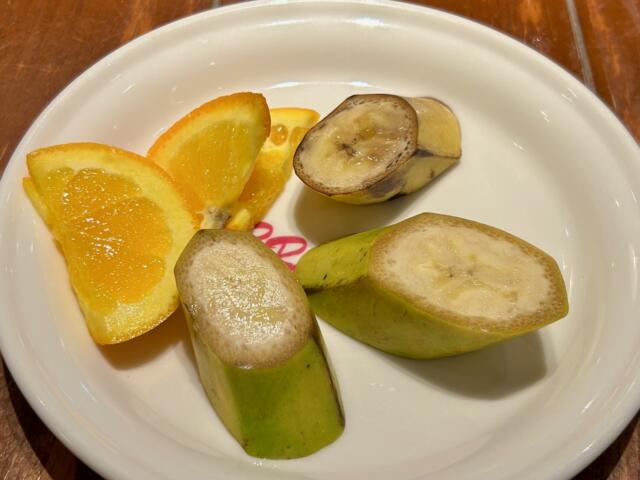 果物はオレンジとバナナがありました。季節によってフルーツは変わるそうです。夏場はパイナップルが登場することもあると聞きました。