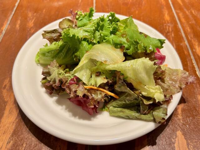 サラダにはレタス、ニンジン、ルーズリーフ、ラディッキオなどが盛られていました。