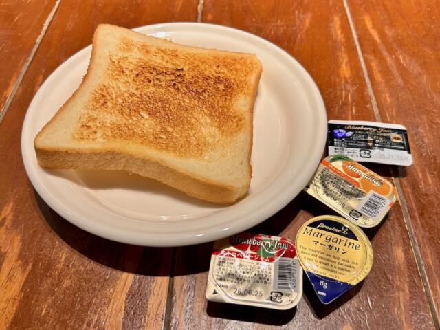 マーガリン、ブルーベリージャム、マーマレード、ストロベリージャムがあったので、好みでこれらをつけてもいいかも。