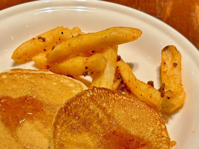 少しだけピリッとしたミートソースのような味でした。パンケーキはメイプルシロップでいただいたのですが、ちょいピリ辛のミートソース的な味わいのフライドポテトが、パンケーキの甘さをひきしめてくれていい感じでした。