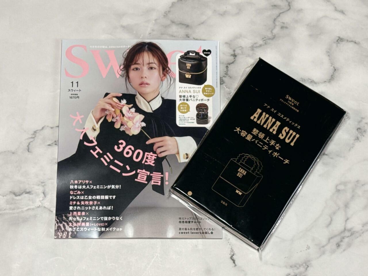 2025年10月10日(金)発売の雑誌『sweet(スウィート)』11月号には、ANNA SUI (アナ スイ)の「大容量バニティポーチ」が付録として付いてきます。