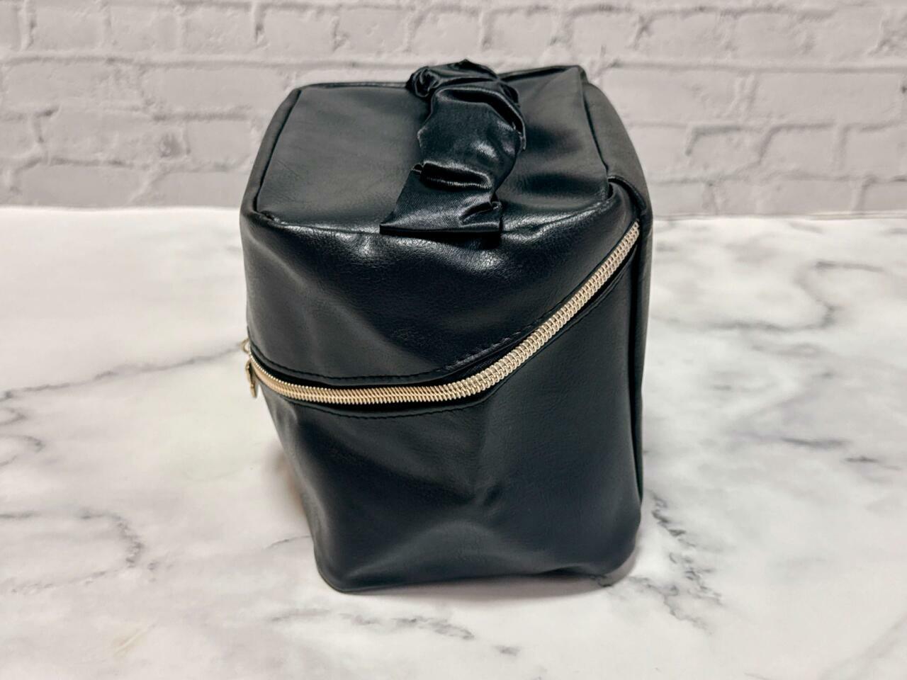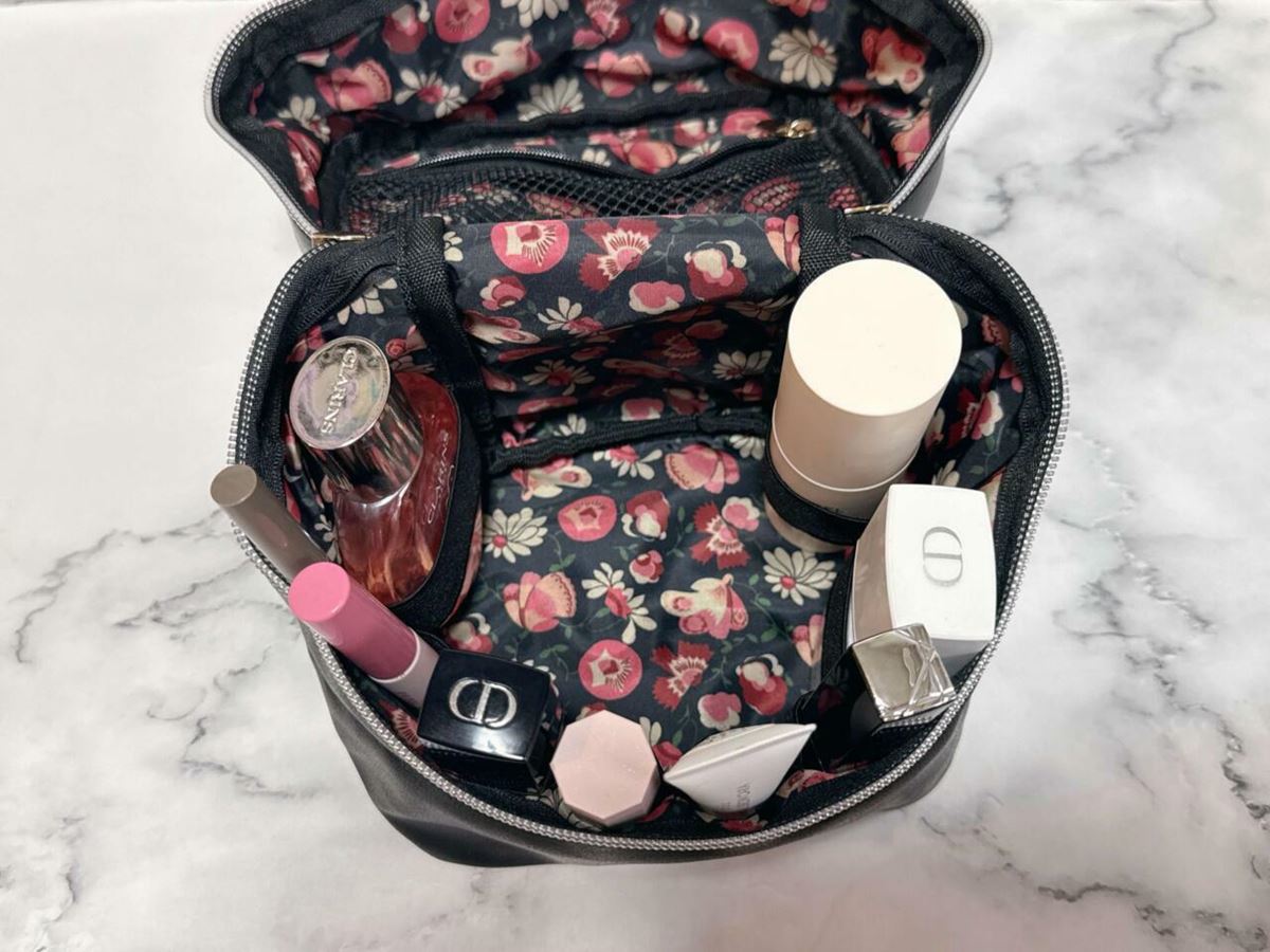 サイズは(約)高さ15×幅14×マチ12cm。見た目以上に収納力が抜群で、メイクの必需品はもちろん、香水やハンドクリームなども収納できました。旅行やお泊まりの際はもちろん、自宅でのコスメ収納ケースとして使うのもおすすめです。