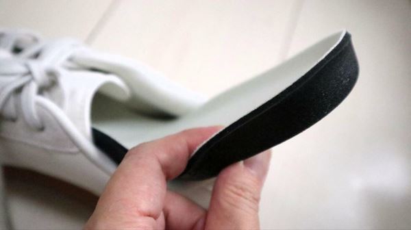 商品名にもある「やわらかい中敷き」を取り出してみると、かかとに向けて厚くなる設計。取り外したあとの底面は、きちんと縫い付けられていることも分かりました。
