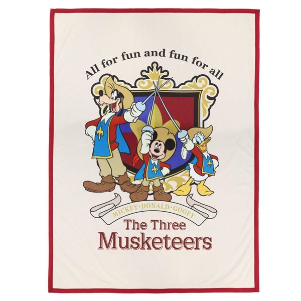 三銃士になったミッキー、ドナルド、グーフィーが、剣を掲げるかっこいいポーズです。