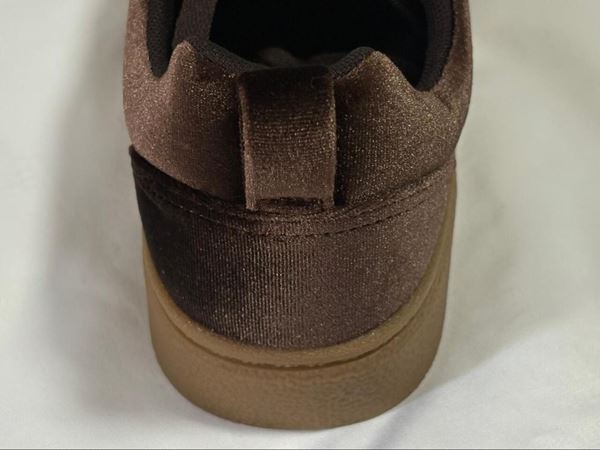 アッパーは全面的にベロア生地で、両サイドに幅広の白ラインが1本入っています。スポーティーな雰囲気もありつつ、ベロア素材と丸みのあるシルエットで大人かわいさもあるデザインです。