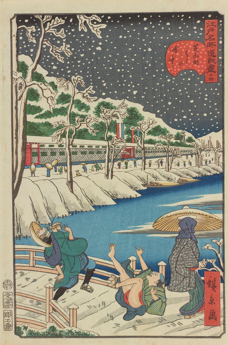 歌川広景《江戸名所道戯尽 十四 芝赤羽はしの雪中》
