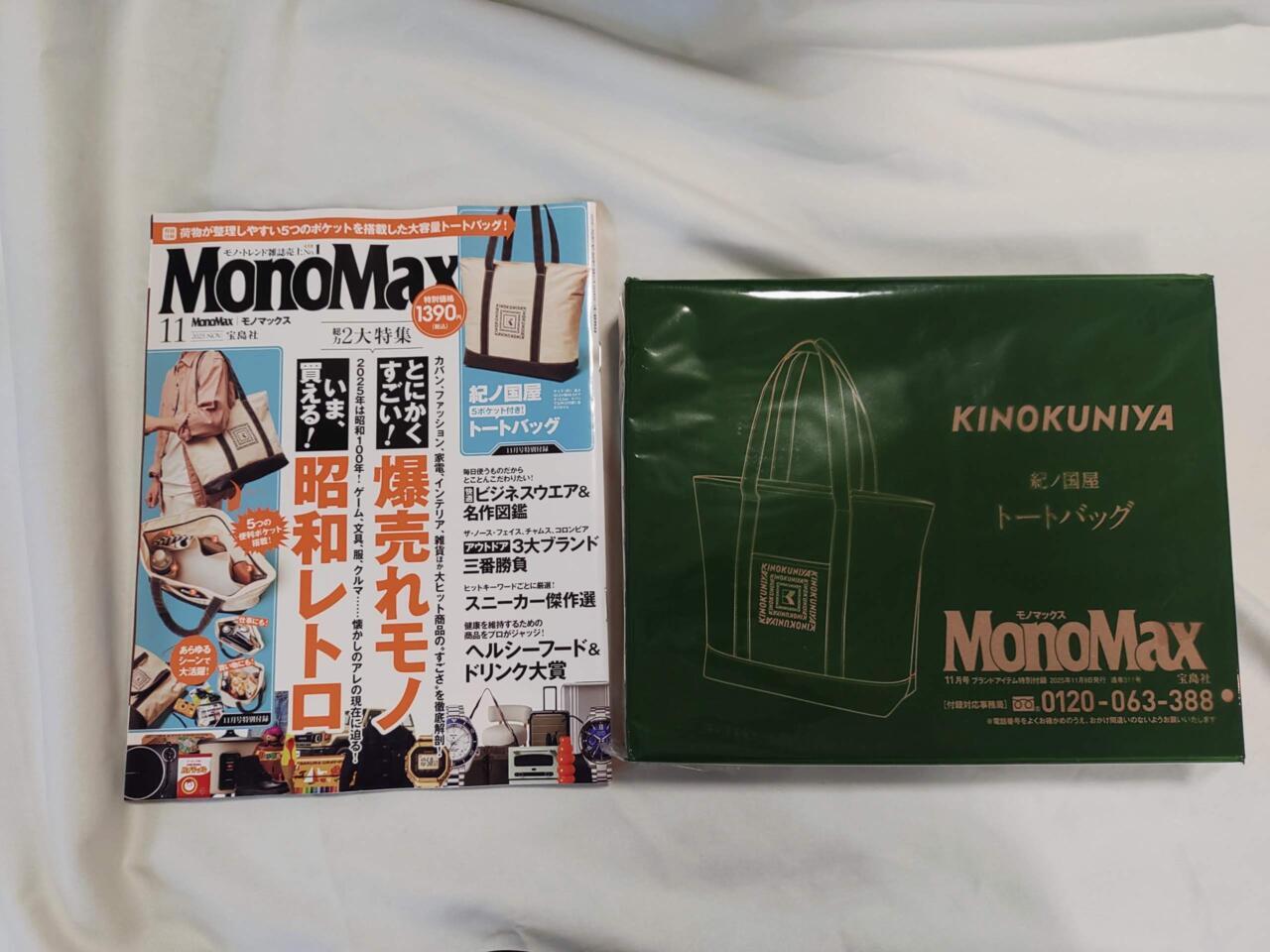 雑誌『MonoMax(モノマックス)』11月号の付録は、紀ノ国屋とコラボした5ポケット付き「トートバッグ」です。