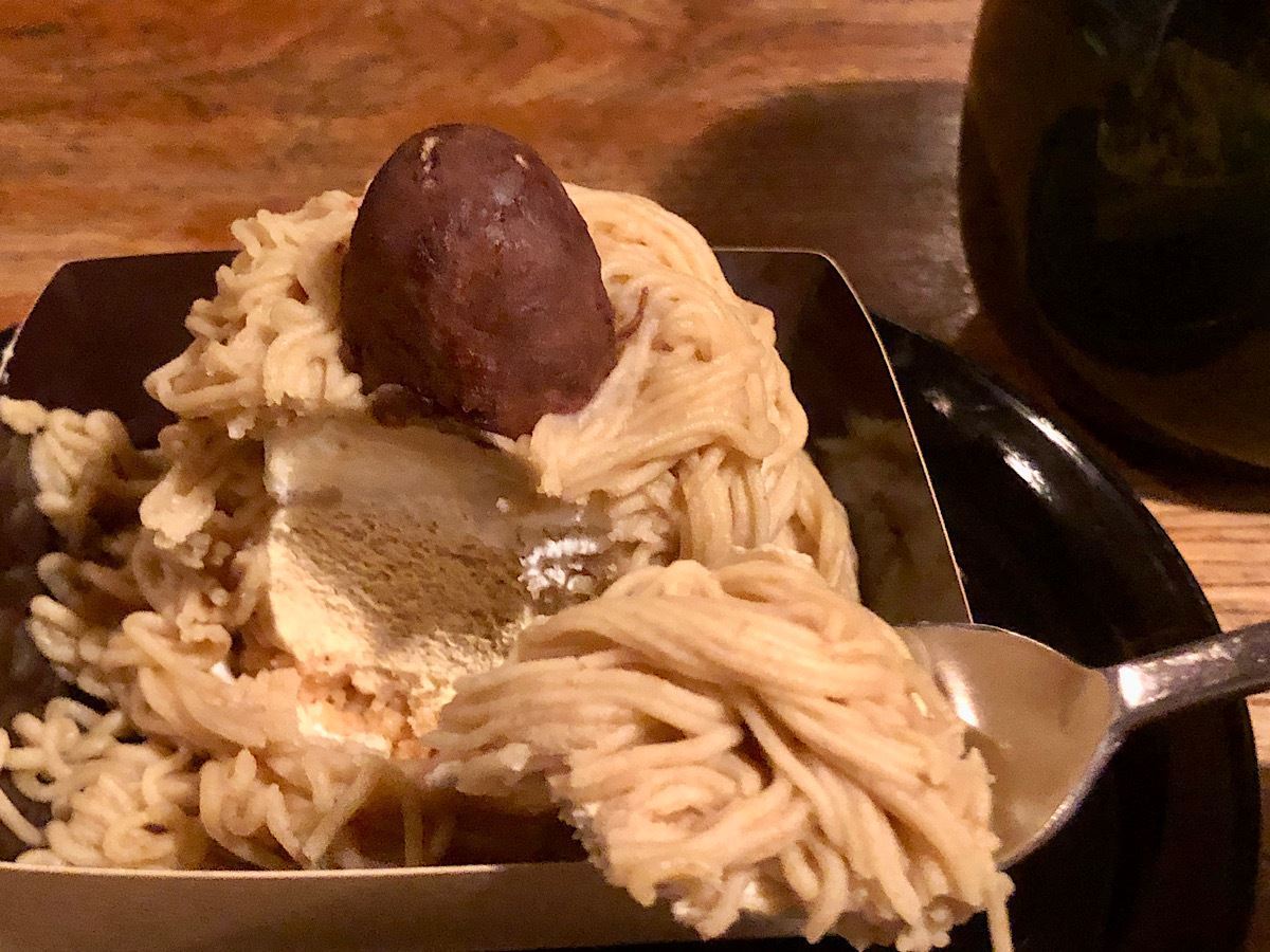 モンブランをパクッと一口食べると、ザクザク甘いクランブルとねっとりなめらかなマロンペースト、しっとりなめらかなマロンムースといった、それぞれ異なる食感と甘さが口の中に広がり、思わずにっこりしてしまいます。