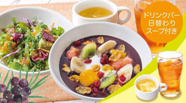 アサイーボウルにサラダ、スープバー・ドリンクバーが付くお得なメニュー。ヘルシーなのに満足感たっぷりな、朝食にぴったりのセットです。