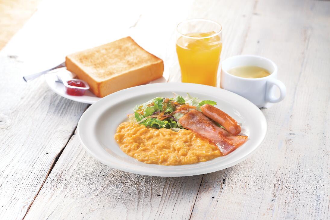 1.「スクランブルエッグ&ベーコンソーセージセット(厚切りトースト・日替わりスープ・ドリンクバー付き)」600~850円(税込)