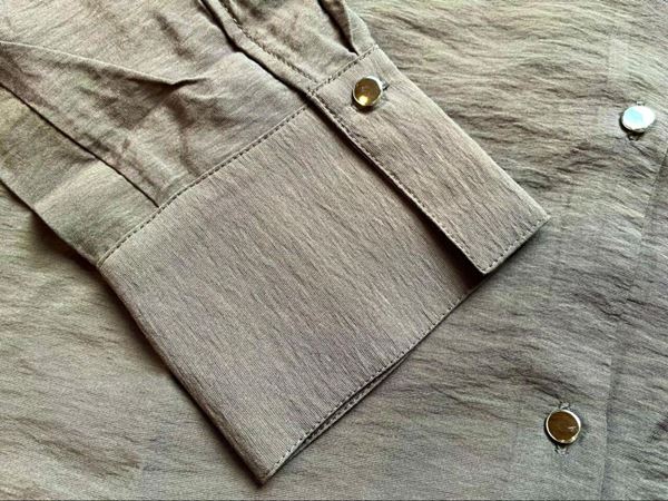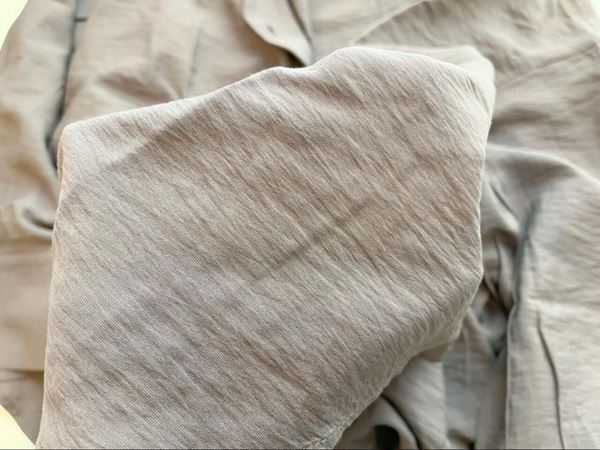 生地は微光沢のある柔らかな手触りで、ほんのり透け感があります。上質さが感じられて、とっても高見えする素材!ただし、ちょっとシワが付きやすい印象なので、洗濯時はネットに入れて、シワを伸ばしてから干すのがおすすめ。イージードライ仕様なので、干した後はすぐに乾きますよ♪