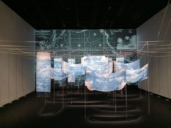 最後に呉夏枝(お・はぢ)の布のインスタレーション《Seabird Habitatscape #️2-banaba, Nauru,Viti Levu》へ。織り込まれたイメージは、オーストラリアの機関が所有する写真アーカイブから引用した、ナウル島、バナバ島、ビディ・レブ島(フィジー)で撮影された写真から写し取られた農園や採掘跡などの風景だ。それらは、欧米諸国や日本、オーストラリアによる占領の歴史を伝えるもので、サイアノタイププリントで青く染められている。布の裏面には、現在のオーストラリアで撮影されたマングローブの風景が写し取られており、過去と現在が層になっている。