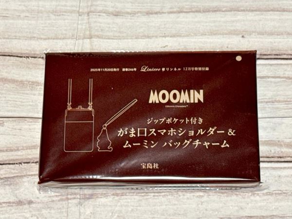 2025年10月20日(月)に発売された雑誌『リンネル』12月号には、MOOMIN(ムーミン)の「がま口スマホショルダー&バッグチャーム」が付録として付いてきます。