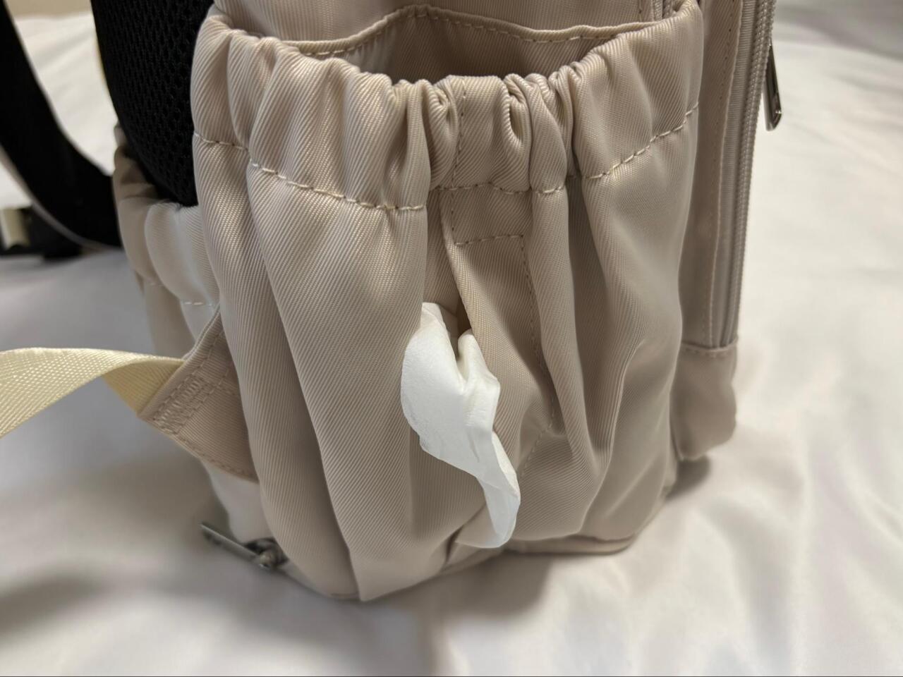 【ワークマン 軽量3レイヤーポケットマザーズリュック】左側のサイドポケットにはティッシュ専用ポケットも搭載!