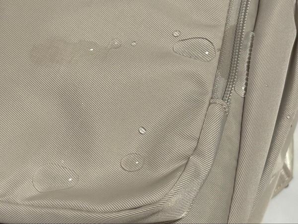 実際に水をかけてみると、しっかりと撥水効果を確認でき、水が染み込むことはありませんでした。ただしファスナー部分にはやや水が入り込んでいたため、大雨の日は注意が必要です。