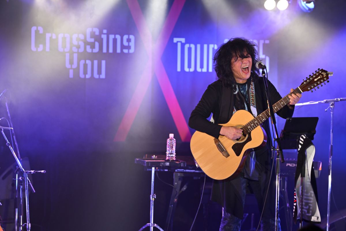 満杯となった会場、登場した福山芳樹は、12弦ギターをかき鳴らして、挨拶代わりに『マクロス7』からFIRE BOMBERの代表曲「DYNAMITE EXPLOSION」をぶちかます。サポートメンバーなしの、ソロ弾き語りのステージになるが、そんなことは関係がない!というほどの音の圧。ハイトーンボイスの迫力も、衰えることを知らない。観客も〈Dynamite Dynamite Dynamite〉と大きな声で歌っていた。JUNNAが好きな曲に挙げていたから急遽、この曲をセットリストに入れたと話していたが、この曲をひとりで表現するスキルフルなところが、やはり百戦錬磨のレジェンドだ。