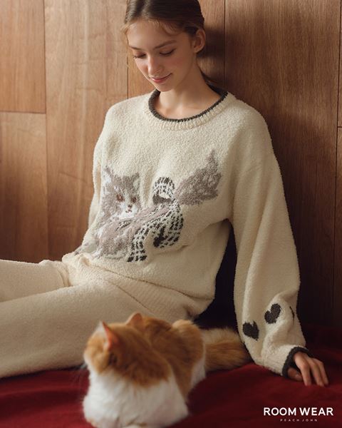 PEACH JOHN ROOMの冬の定番、ホイップクリームのようにやわらかな肌ざわりとあたたかさのモールニット、「ホイップリー」素材のパジャマが今年も登場。リボンを結んだ、キュートな子猫のジャカード柄入り「キャットホイップリーパジャマ」7,980円(税込)です。