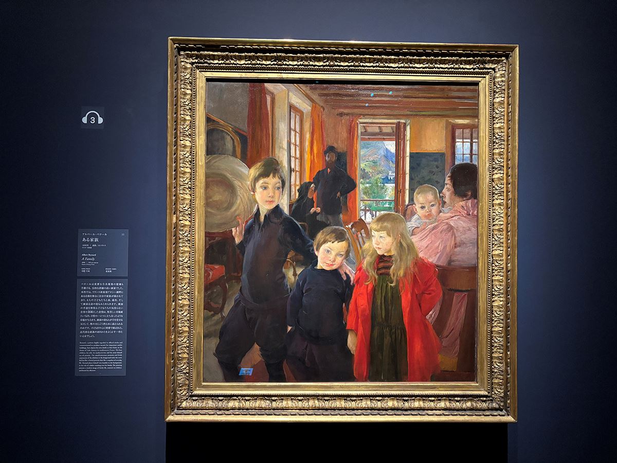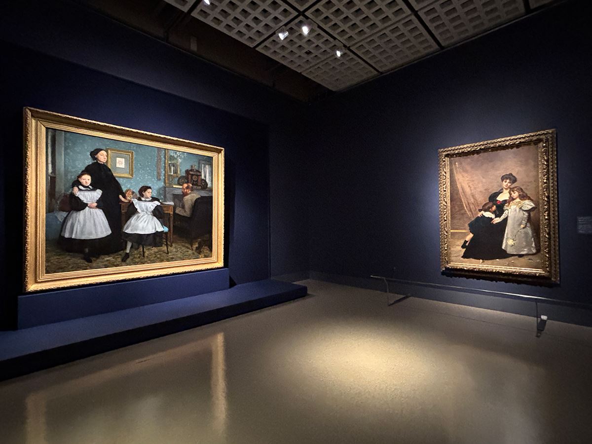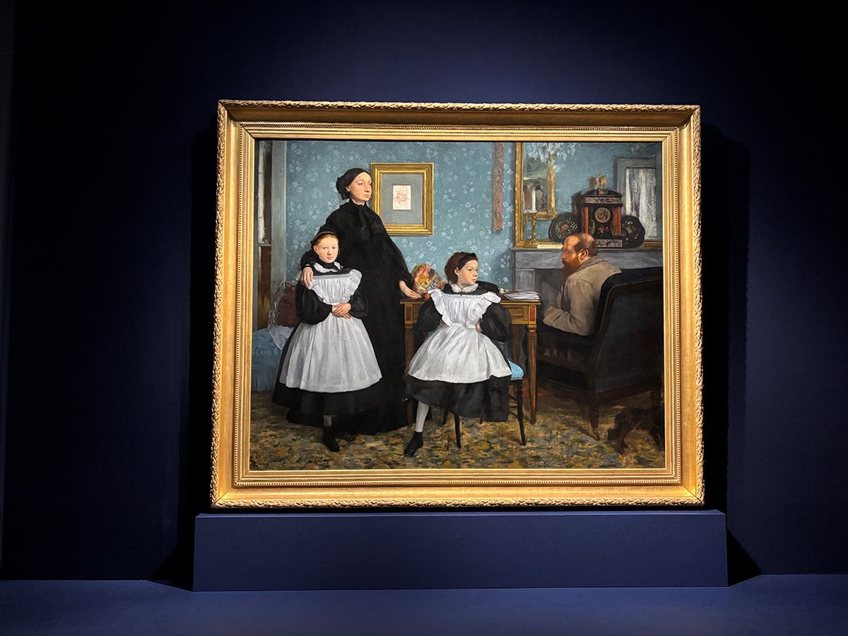 第1章ではそうした読み解きが興味深い作品や、家族や母子を描いた微笑ましい作品も並ぶが、なかでも圧巻なのは、若き日のドガがイタリアに住む伯母の家族を描いた大作《家族の肖像(ベレッリ家)》だ。縦寸が2メートルを超えるこの絵では、敬愛する父親を亡くしたばかりの伯母が喪服姿で、また政治活動ゆえに亡命中の身である夫の男爵がこちらに背中を向けて描かれている。毅然とした妻と孤立した夫、きまじめそうな姉とおしゃまな印象の妹の対比や、画面からうかがえる夫婦の不和といった心理的なドラマ性も面白いが、衣装や壁紙、絨毯の質感などの描写の緻密さや、ブルーをはじめとした色彩の美しさも素晴らしい。修復を終えたばかりのこの作品は、今回初来日の作品だ。