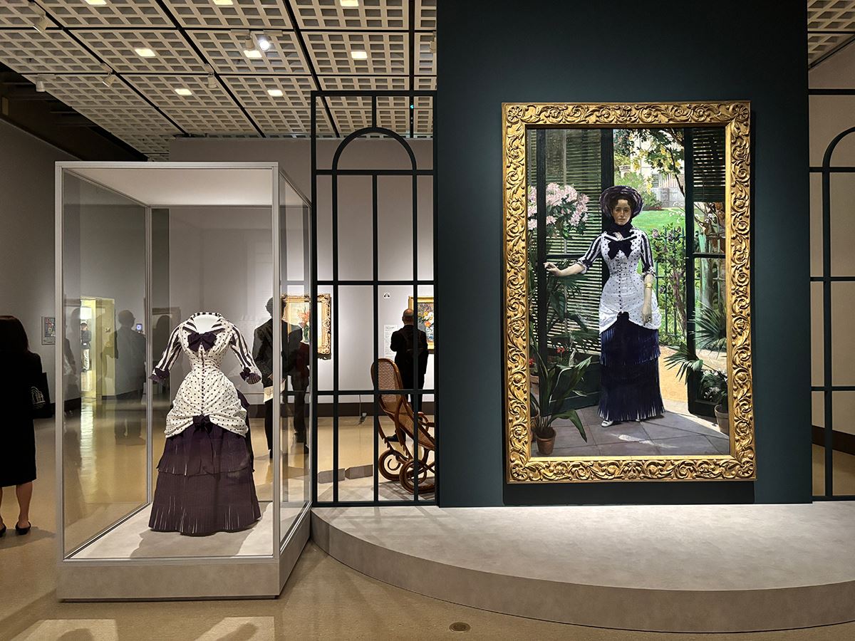 第3章「室内の外光と自然」では、室内でありつつ外の空間と光を取り入れたバルコニーや温室を舞台とした絵が並ぶ。最初の作品はバルトロメの大作《温室の中で》。光あふれる緑の庭を背に立つファッショナブルな衣装の妻を描いた作品で、実物のドレスとともに、温室というくつろぎの空間を感じさせる寝椅子や読書テーブルも合わせて展示されている。彼女は若くして亡くなり、画家が愛する妻の遺品を大切にとっておいたため、ドレスも残されていたという。