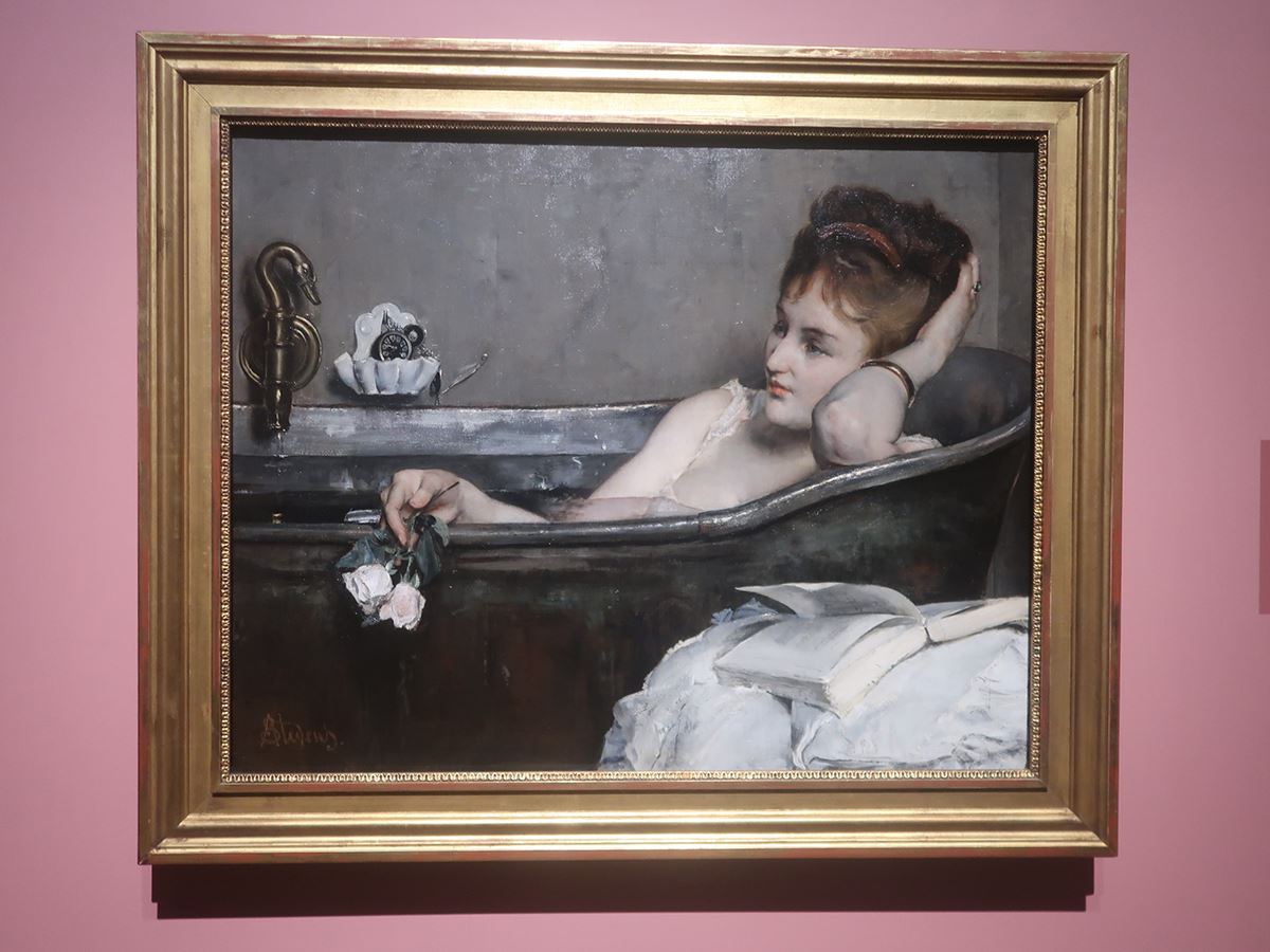 第2章には、こうした家庭内の楽しみのほか、女性が裁縫や刺繡にいそしむ姿や、さらに奥の私室で身づくろいや入浴をする場面を描いた作品も続く。この章で気づくのは、描かれているのは圧倒的に女性が多いこと。当時は、女性の領域は私的な室内とされており、上流の女性は一人で外出することも許されなかった。親密な雰囲気の室内情景には、そうした時代背景も内包されている。