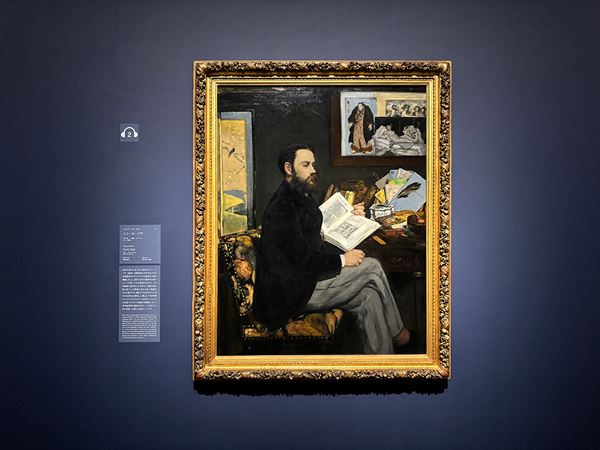 室内の肖像画の見どころのひとつは、描かれた人物の職業や芸術家としての理念、交友関係、趣味や関心、そして社会的ステータスなどが部屋のしつらえや描き込まれた品々からうかがえて、その読み解きが楽しいことだ。たとえばマネによる文豪ゾラの肖像では、机の上の本や文筆道具が職業を、屏風や浮世絵版画が日本趣味を教えてくれる。二人が盟友となったきっかけは、スキャンダルを起こしたマネの裸婦像《オランピア》をゾラが擁護する批評を刊行したことだそうで、その複製画と小冊子の表紙も画中に見られる。