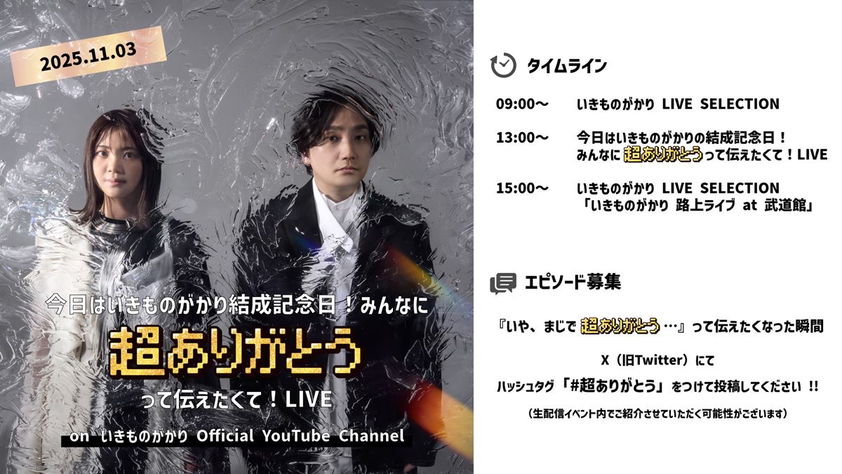 『今日はいきものがかりの結成記念日!みんなに超ありがとうって伝えたくて!LIVE』と題したこの生配信では、ゲストを招き、これまでの活動を支えてくれたファンの皆さんやスタッフにいきものがかりが26年分の感謝を伝える内容となっている。