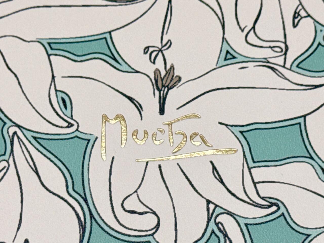 カバーの表紙、裏表紙ともにゴールドの箔押しで「MUCHA」のロゴ入りなのもうれしいポイントです。裏表紙はミュシャの手書きサインで、ファンの方は必見!