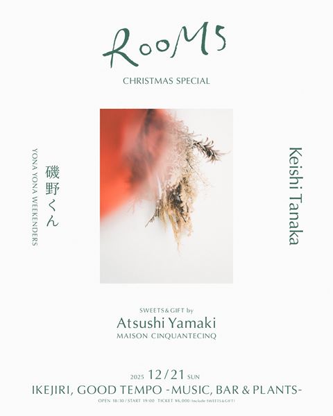 また、12月21日(日)には東京・池尻の旧中学校校舎にて弾き語りの自主企画『ROOMS CHRISTMAS SPECIAL』を開催。ゲストに磯野くん (YONA YONA WEEKENDERS)、SWEETS & GIFTにAtsushi Yamaki(MAISON CINQUANTECINQ)を迎えたスペシャルなイベントとなる。