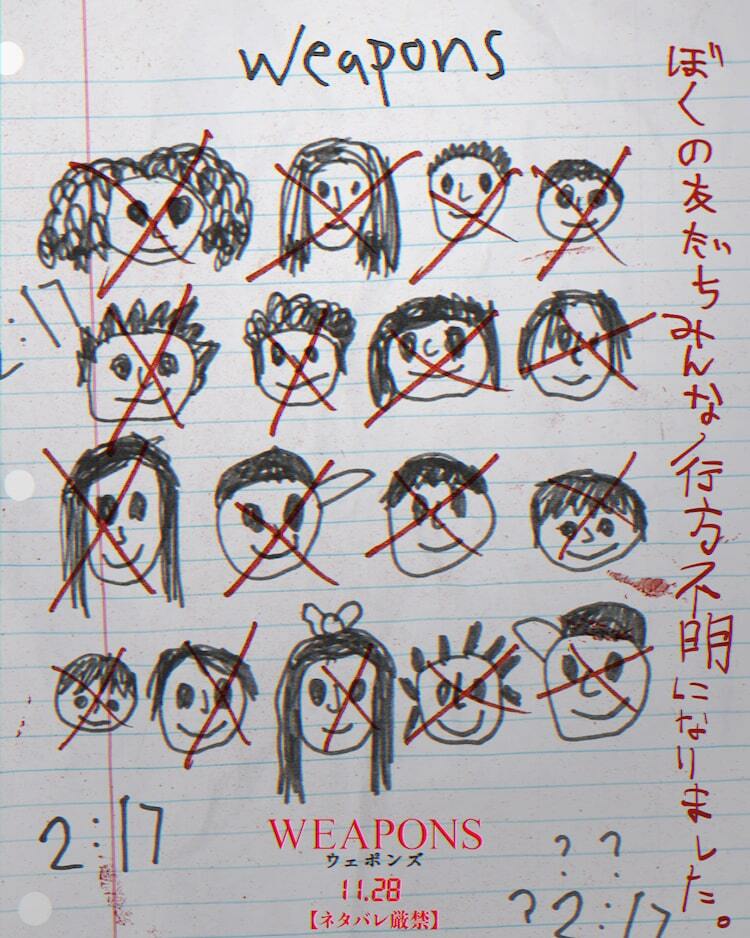 ホラー映画「WEAPONS/ウェポンズ」より、児童集団失踪事件について語る“変な”予告が到着。あわせて3枚の“変な”落書きも公開された。