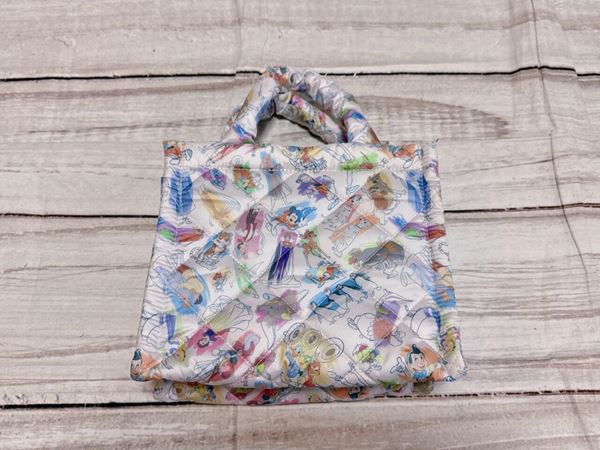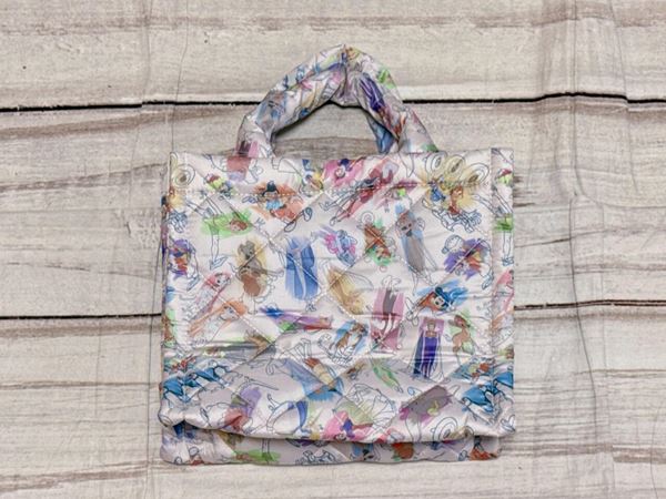 くすみカラーがメインのふわふわのDisneyキルティングバッグは、超貴重なディズニーアートの総柄デザイン!まさにディズニーの壮大な歴史が感じられます。