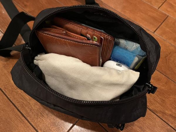 実際に使ってみて感じたのは、手ぶらで歩ける心地よさです。財布やスマホ、鍵など必要なものをポーチひとつにまとめるだけで両手が空き、解放感たっぷり!