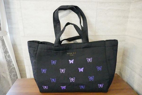 今回ご紹介した「ANNA SUI mini刺繍トートバッグ」は、縦縞模様のキルティング生地に蝶々の刺繍と立体パーツがとにかくおしゃれなバッグです。