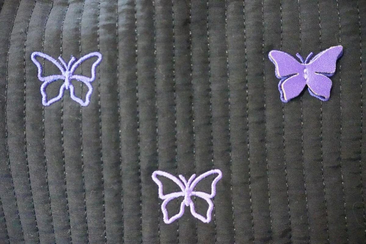 14羽の蝶がモチーフになっています。色味の異なるパープルの刺繍糸を使用しているので、同じパープルでも華やかさがあります。