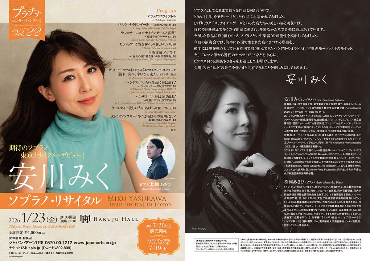 デラックアの《ヴィラネル》やベルクの〈ナイチンゲール〉(《初期の7つの歌》より)をはじめ、さまざまな言語による作品が並んでおり、それぞれの国ならではの響きによる鳥の音色を楽しめるプログラムとなっている。そして後半には宗教曲やオペラのアリアによってさらに安川の歌唱の多彩な魅力を味わうことができる。