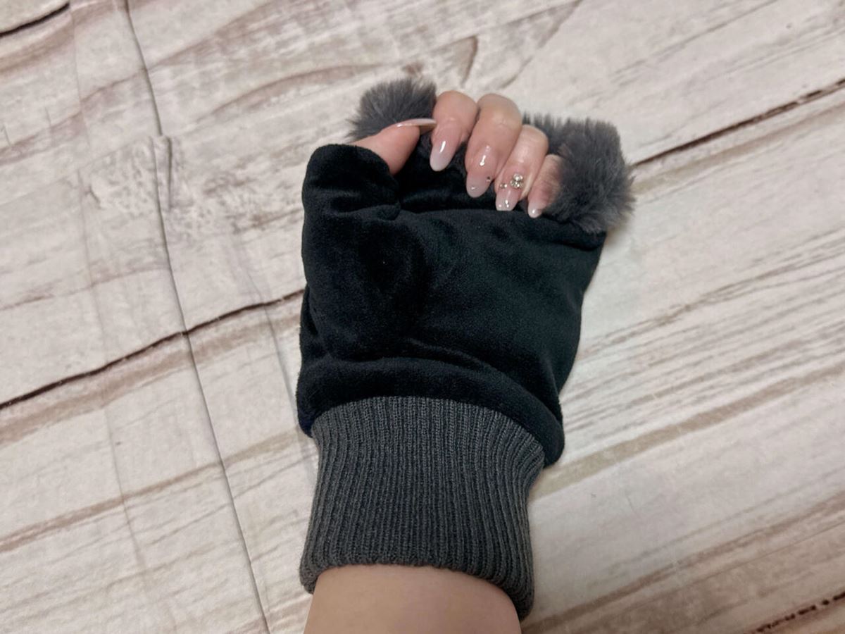 指先、手の甲、手のひら、手首と場所によって素材が異なる点がおしゃれなポイント!手のひら部分がベロア調の生地、指先部分はファー、手首部分はリブが用いられています。異素材のカラーもグリーンとサックスでそれぞれ異なり、グリーンはグレー、サックスはホワイトで印象がガラッと変わるので、お好みで選んでみてくださいね!
