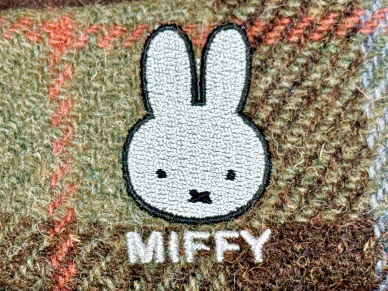 右手側にちょこんとミッフィーの刺繍があしらわれており、大人かわいいポイントです。左手側には、ハリスツイードのお馴染みの織りタグ付き!