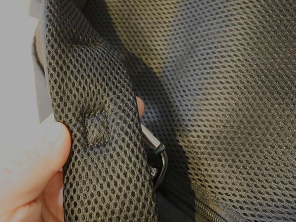 このリュックの最大の特徴は、ショルダー部分に付いたカラビナ。