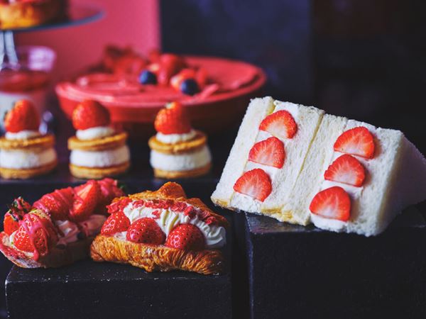 ストロベリースイーツ:ストロベリーシャンパンタルト、ストロベリーとローズのブランマンジェ、ストロベリーエクレア、ストロベリーとルビーチョコレートのシフォンケーキ、ストロベリーパートドフリュイ、ストロベリータブレット、ストロベリーメレンゲ、ストロベリー"パキパキ"ティラミス、ストロベリーとピンクペッパー、ストロベリーマスカルポーネムース、ストロベリーと抹茶、ストロベリーとベルガモットのモンブラン、ストロベリーパブロバ、ストロベリーココナッツ、ストロベリーミルフィーユ