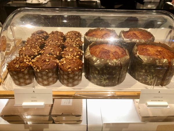 Aセット最後のメニューはバナナブレッド。店頭のショーケースにドンっと存在感たっぷりに並べられており、モーニングで注文すると1/4サイズに切って提供してくれます。今回はマンダリン オリエンタル 東京ブレンドティー(ホット)をお供にいただくことにします!