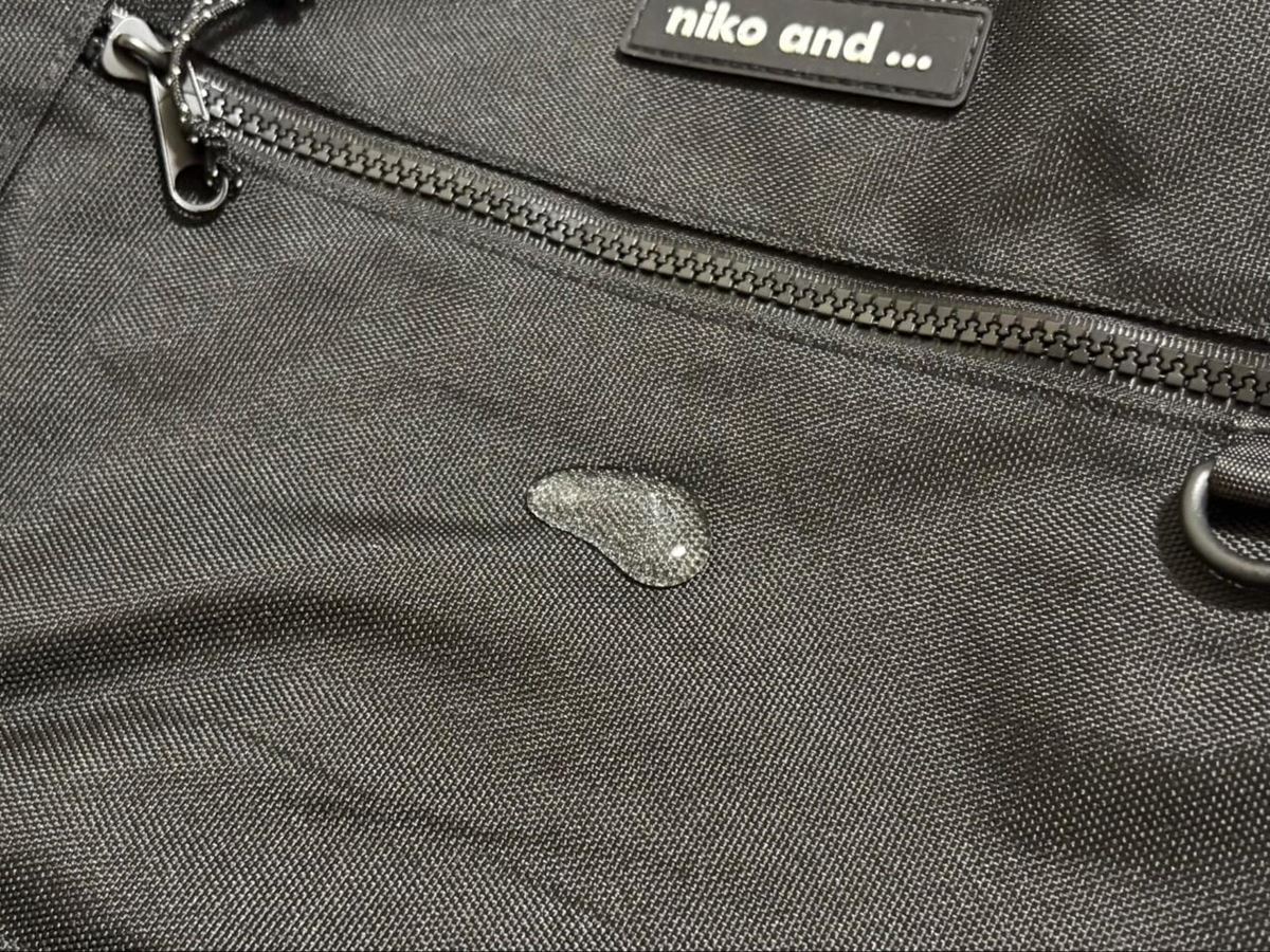 【niko and... 撥水メニーポケットデイパック】撥水加工つき。実際に水を垂らしてみると、しっかり弾いて内部に染み込みませんでした!