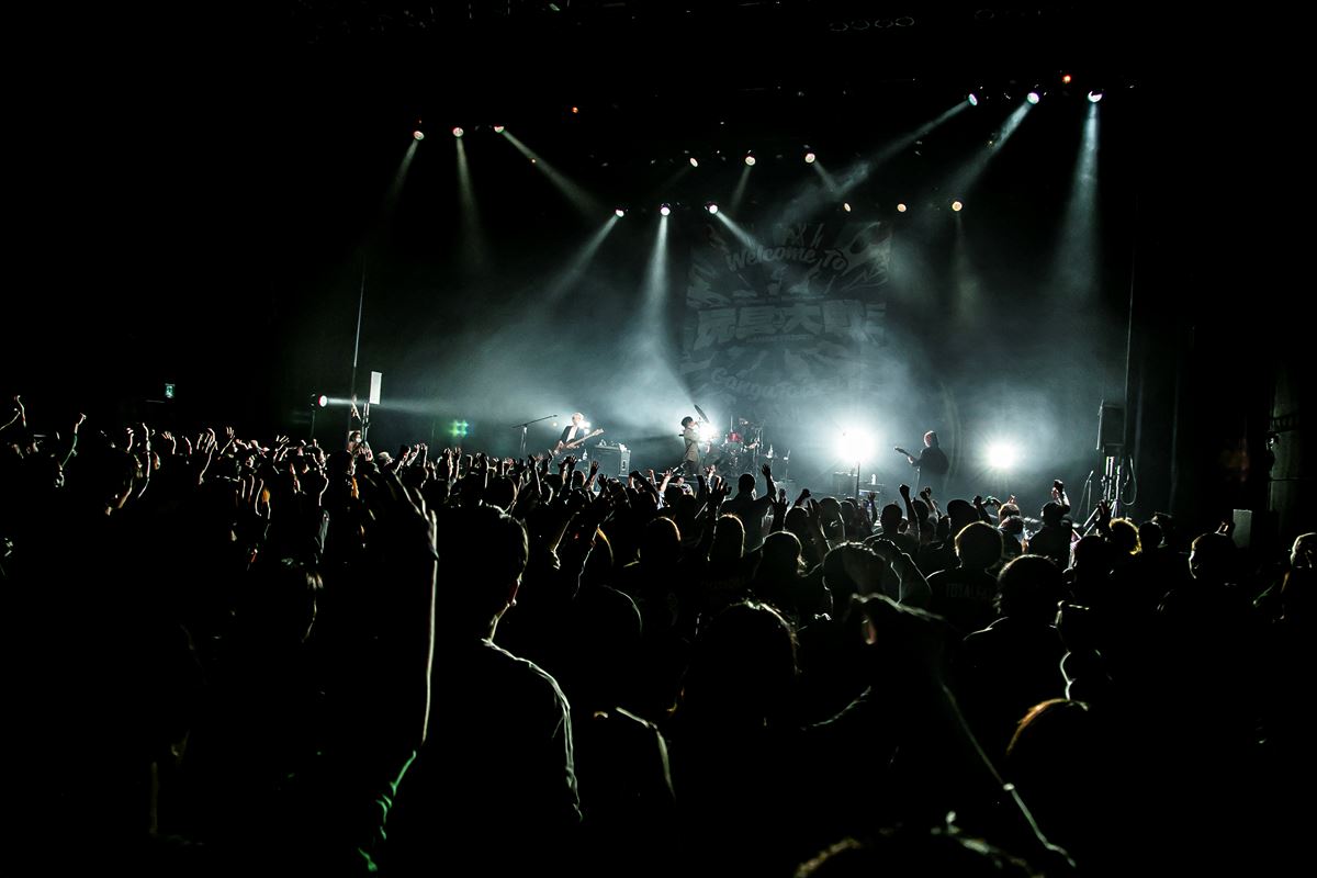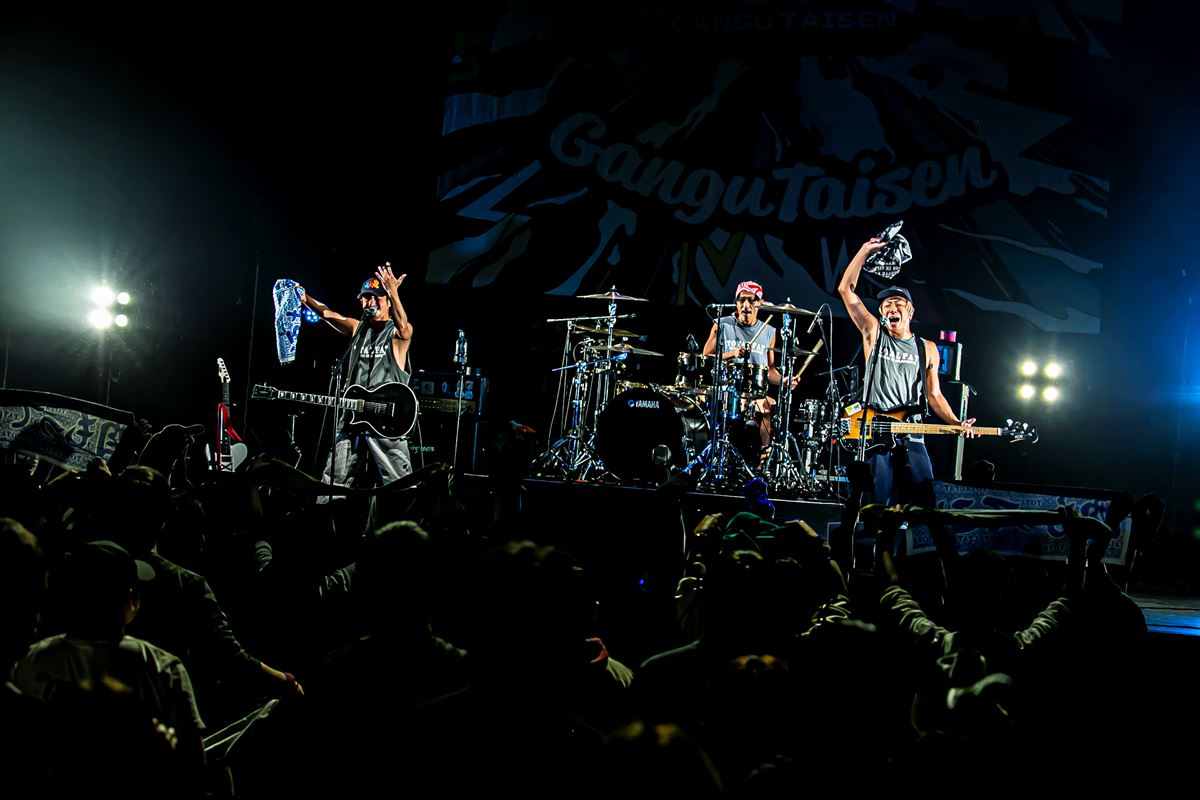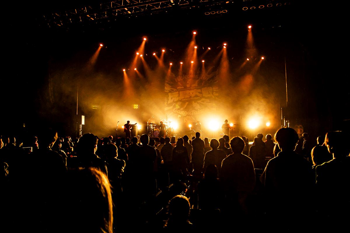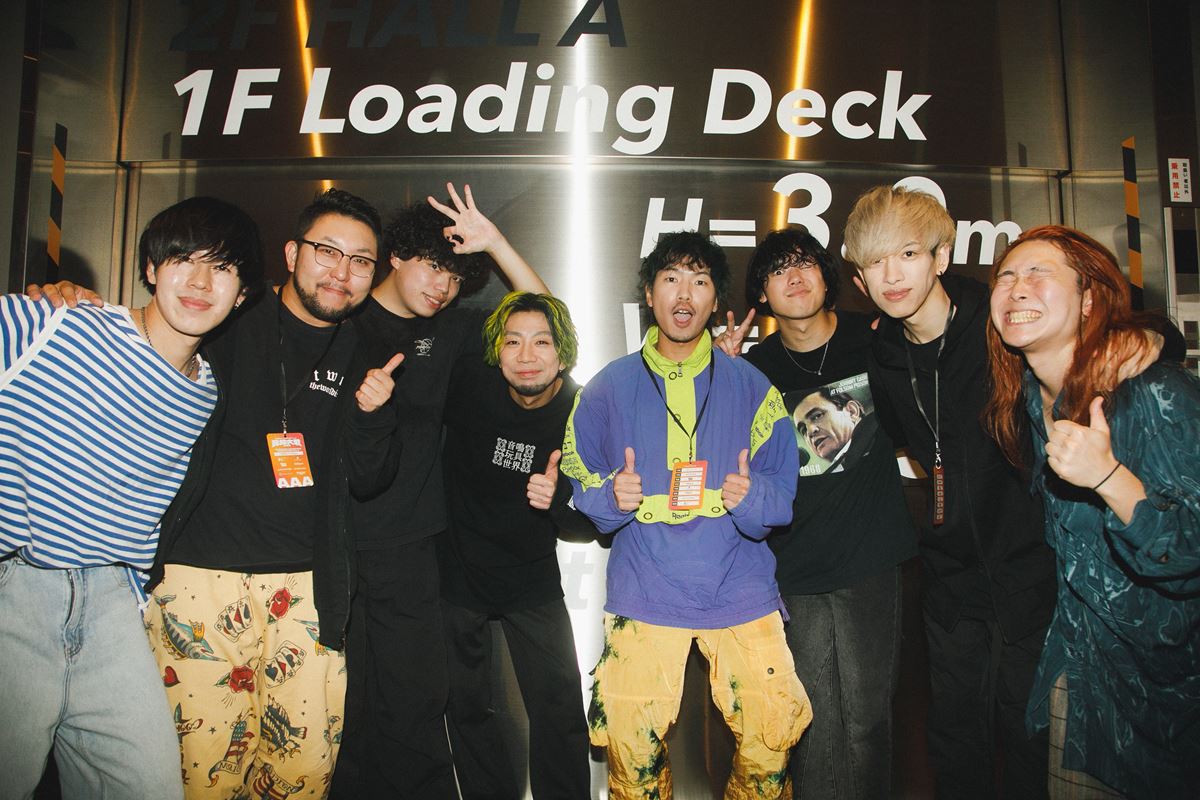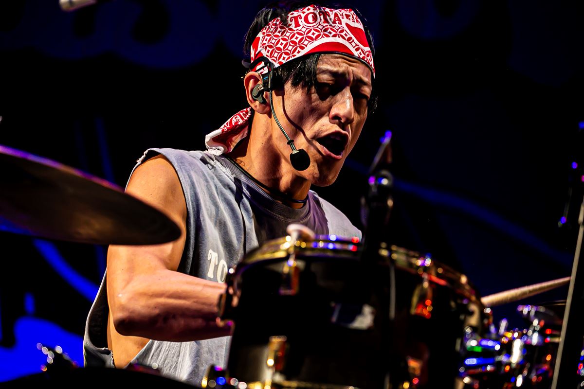 凶悪な重低音とは不釣り合いなほどのご機嫌なコール&レスポンスが行き交う1曲目は「PARTY PARTY」。生憎の肌寒い陽気となったが、TOTALFATの3人にとってはどこ吹く風だ。「俺たち袖なしですよ」と薄着で音ステージしたことを誇らしげに語るShun(vo/b)の発言は「夏のトカゲ」の前振り。ラテンノリと2ビートを行き来する中、色とりどりのタオルが打ち振られ、会場が揺れる。続いて所沢が地元であるBunta(ds)が「Fireworks」イントロのマッシブなビートを振り下ろすと、ますます会場が揺れる。シーンで言うとパンク寄りの存在ではあるが、こういう多種多様な音楽が集う場においても親和性が高い……というか、頭ひとつ抜けた求心力を発揮できるのは半端じゃない。
