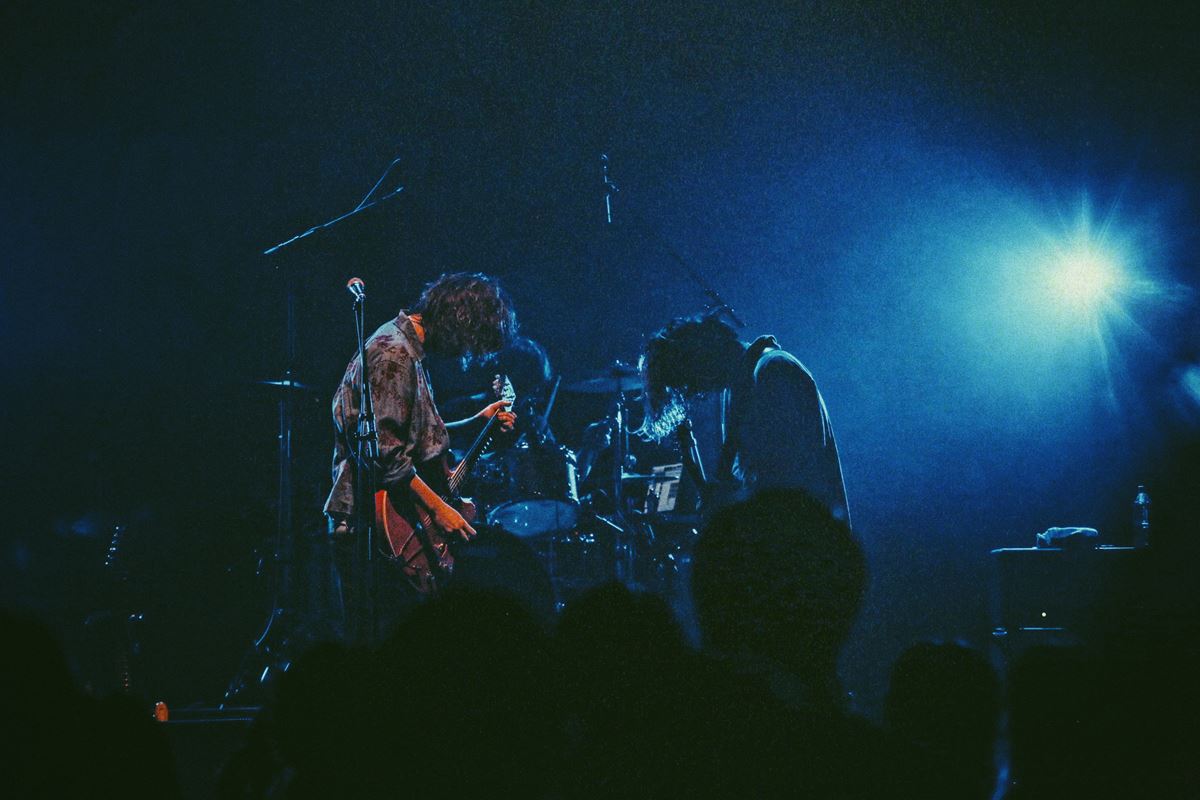 リハから板付きでぶっ放したわずか1分ほどのファストチューン「爆音の鳴る場所で」がkoboreの何たるかを一発で知らしめる。ギュッと一丸になったまま、ハイテンションで突っ走っていく4つの音。物理的な距離も近いためたまにゴチャついたりもする様子すらライブの熱に拍車をかけていく。その一方で佐藤赳(vo/g)が魂を込めて一語ずつはっきりと発声する歌は浸透力抜群だ。