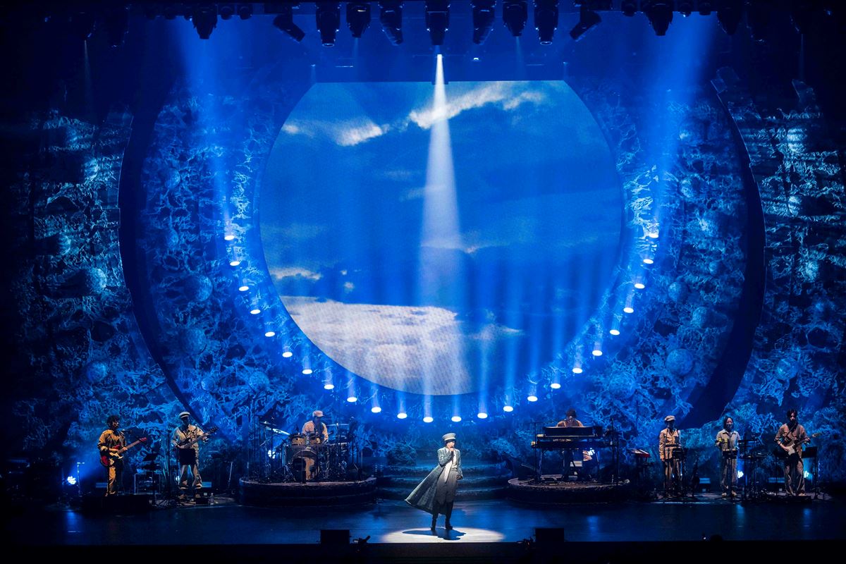 時空の意識を示唆する曲「不思議な体験」から、新たな衣裳でユーミンが中央に立ち、本題『Wormhole / Yumi AraI』の1曲目「DARK MOON」へと壮大に展開していく。ワームホールを想起させる円形の舞台装置も楽曲もプログレッシヴ・ロックの先駆者ピンク・フロイドを想起させ、しかも「不思議な体験」を収録した『VOYAGER』のアルバムジャケットを手掛けたのはピンク・フロイドの盟友ヒプノシスと、その縁までも浮かび上がる。“昔のままじゃない”と歌う「キャサリン」へ続くと、観客は現実と非現実の波間へと誘われていく。