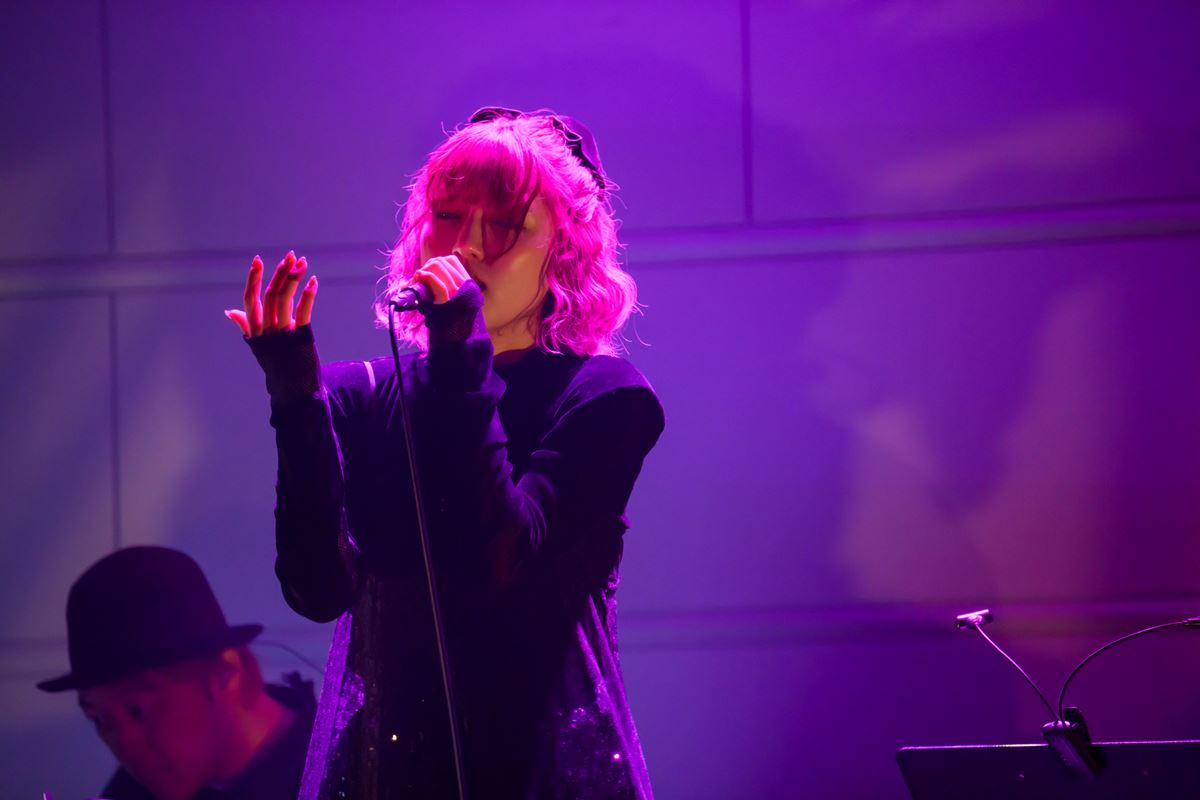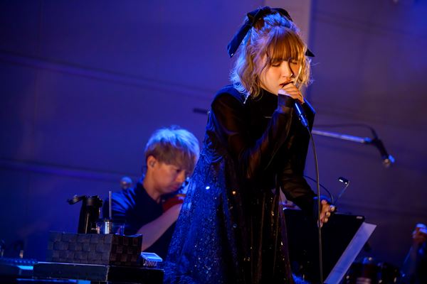 ライブの終盤は「立って楽しんでほしい」と伝え、「Sleepless」から少しずつ会場の温度を上げていく。「Sleepless」はアッパーな曲ではないからこそ、ダークでヘヴィな空気感を纏って届けられた。 そこからシームレスにパーカションが曲をつなぎ、ヴァイオリンとチェロがイントロのフレーズを奏でると始まったのが、『マクロスΔ』から、Yami_Q_rayの「綺麗な花には毒がある」。大胆なアレンジと、5人曲をひとりで歌うボーカルが圧倒的だった。みんなで声を出して盛り上がったのは「紅く、絶望の花。」。ロックバンドを背負ったときのように煽るわけではないが、出力をどんどん上げていく。ストリングスアレンジながら、エネルギッシュなボーカルに観客も声を上げ、拳を上げていた。