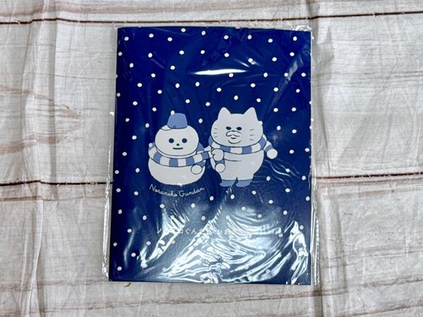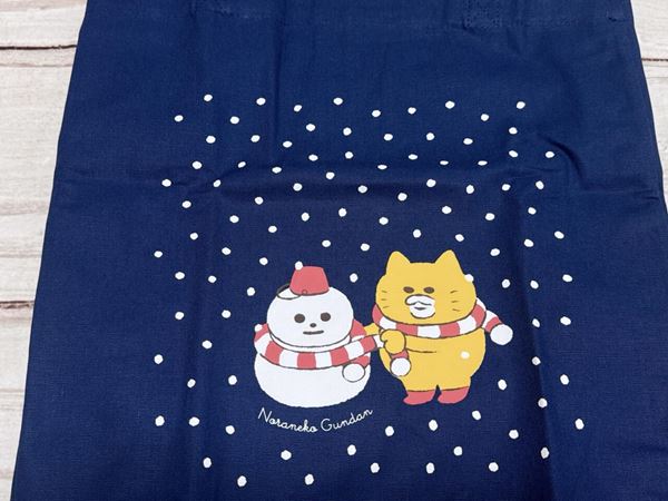 雪だるまにお揃いのボーダーのマフラーをかけてあげる、ノラネコぐんだんのひとりがかわいすぎる〜!地のカラーがネイビーなため、背景の降りしきる雪や雪だるまが映えます♪