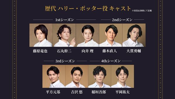 これまでにハリー・ポッター役を務めたのは、藤原竜也、石丸幹二、向井理、藤木直人、大貫勇輔、平方元基、吉沢悠、稲垣吾郎、平岡祐太、上野聖太(カバーキャスト)の計10名。ひとりひとりが持つ個性と演技がそれぞれのハリー像を作り上げ、物語を紡いできた。他の主要キャストもダブルキャスト、トリプルキャストを採用しており、同じセリフ、同じシーンでもキャストの組み合わせにより無限大の楽しみ方ができることが特徴だ。