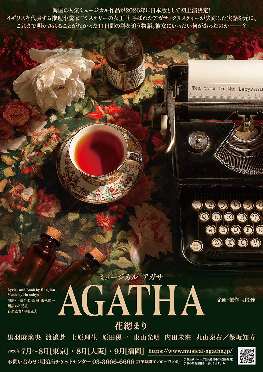 花總は「2024年に韓国でミュージカル『AGATHA』を拝見しました。冒頭から“これぞアガサ・クリスティの世界!”と思わせるミステリアスな世界観に引き込まれる感じがして、最初から最後まで圧倒される舞台でした」とコメント。さらに「2026年はアガサ・クリスティ没後50年にあたります。その年に日本で上演できるということで、心をこめて大切に演じていきたいと思います」と意気込みを寄せた。