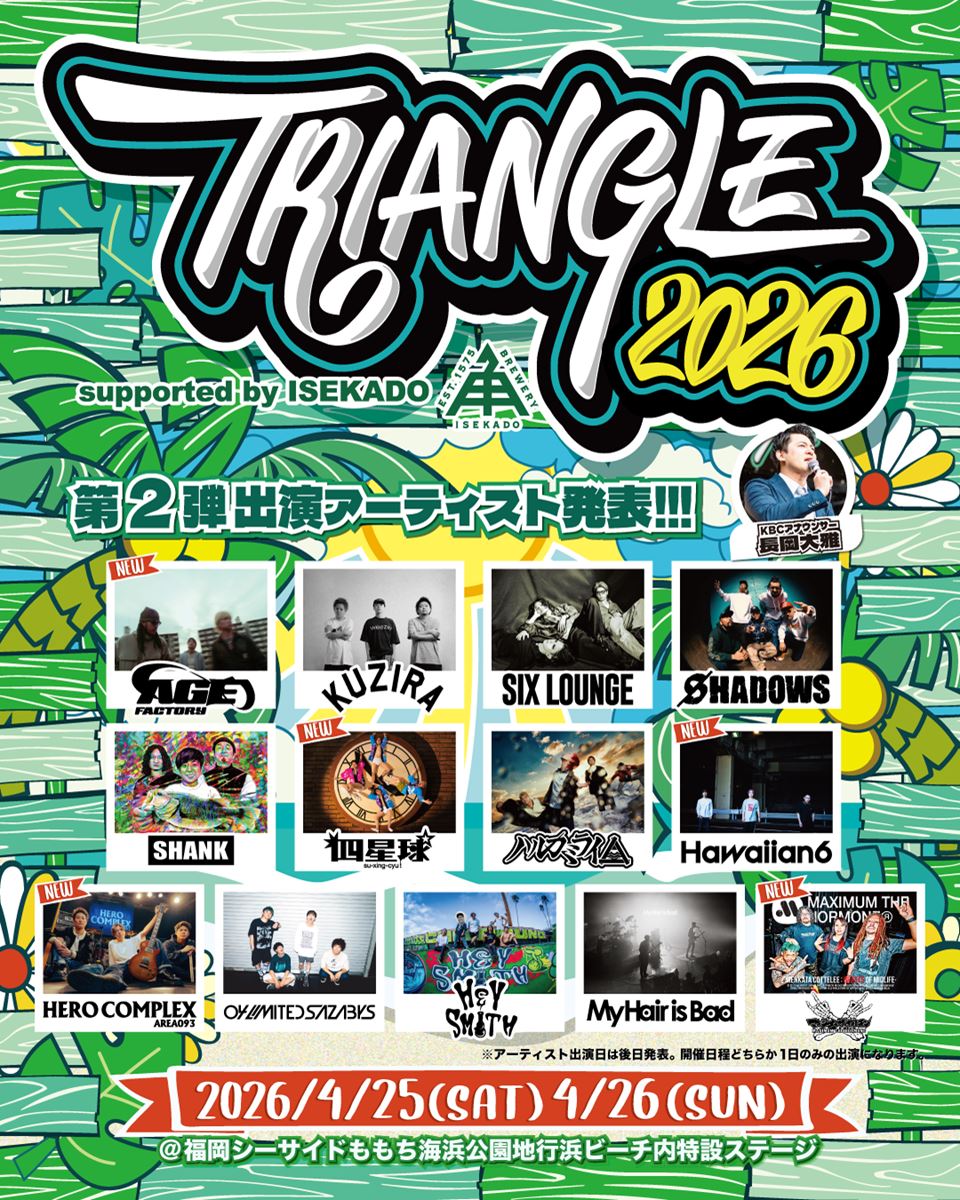 2026年4⽉25⽇(⼟)・4⽉26⽇(⽇)に福岡・シーサイドももち海浜公園地⾏浜ビーチ内特設ステージにて開催される『TRIANGLE 2026』の第二弾出演アーティストが発表された。