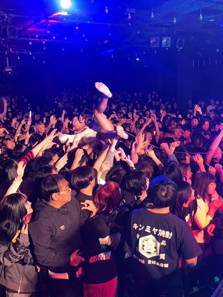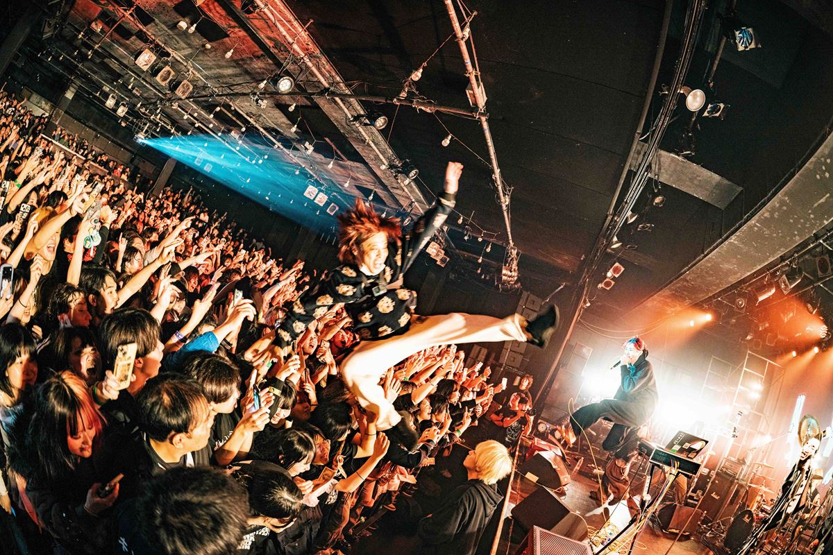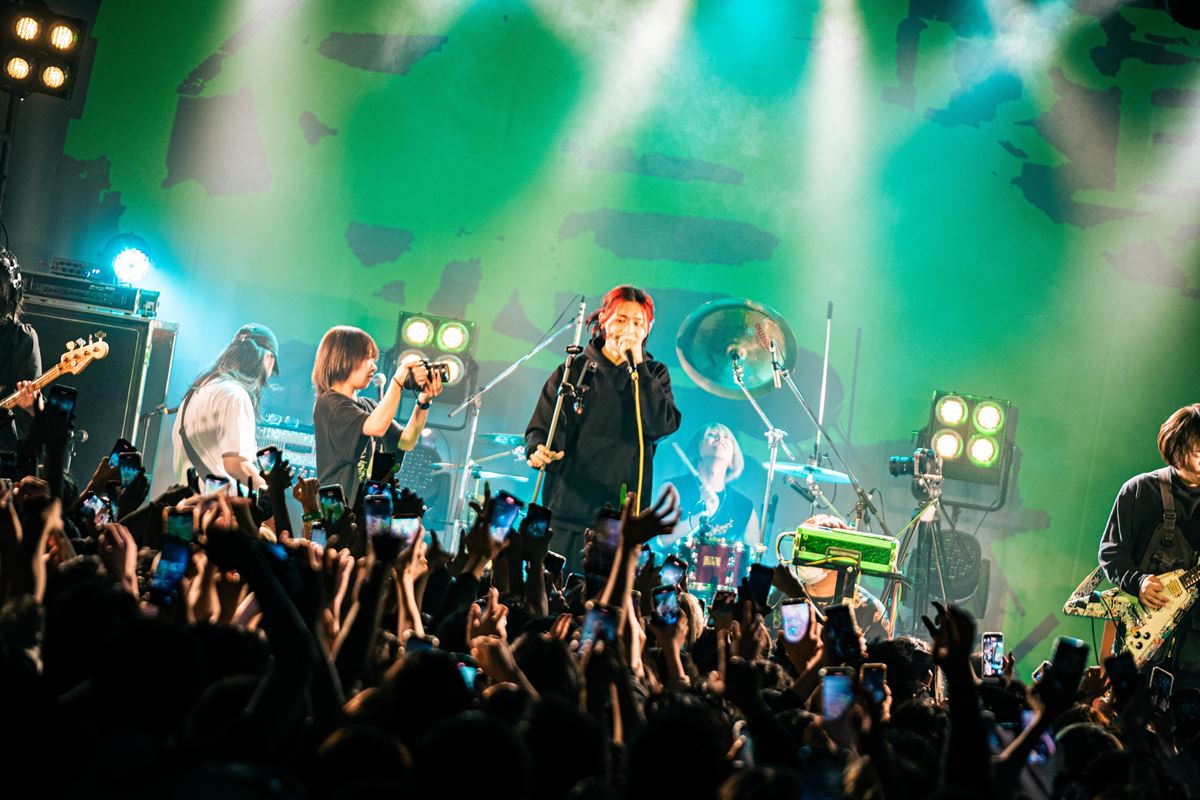 そうして爆音を響かせながら「チケット代がいつもより高かったでしょ?還元します!」とメンバーが偽札を客席にばら撒くのだが、その偽札にはQRコードが印刷されているというプロモーションも実に巧みで、さらには誕生日を迎えたばかりのおくゆうを祝うべく「ハッピーバースデー」を観客も一緒になって歌う。このバンドの愛されっぷりがわかる一幕だ。